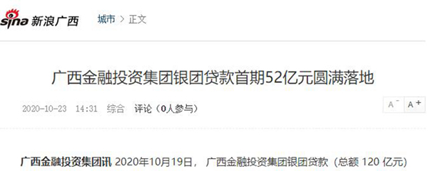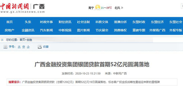近日,中新网广西、新浪广西报道广西金融投资集团银团贷款首期52亿元圆满落地情况,全文如下: