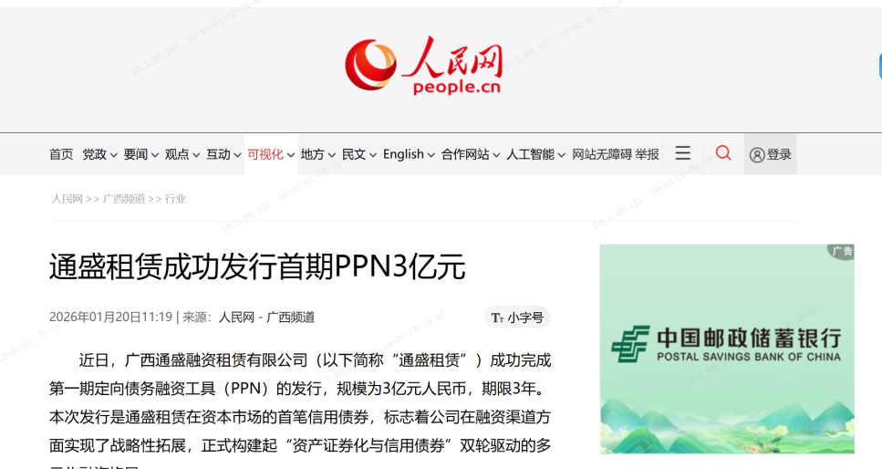 近日,广西通盛融资租赁有限公司(以下简称“通盛租赁”)成功完成第一期定向债务融资工具(PPN)的发行,规模为3亿元人民币,期限3年。本次发行是通盛租赁在资本市场的首笔信用债券,标志着公司在融资渠道方面实现了战略性拓展,正式构建起“资产证券化与信用债券”双轮驱动的多元化融资格局。