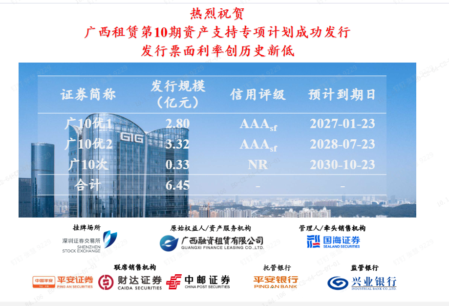 春风传捷报,奋进启新程!近期,广西融资租赁有限公司(以下简称“广西租赁”)在深圳证券交易所成功发行2026年第一期资产支持专项计划(ABS),这是公司获得AA+主体信用评级后的首次ABS发行,标志着公司资本市场运作能力再获突破、品牌影响力持续攀升。